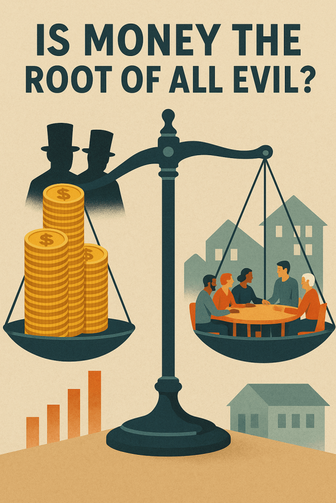 Money itself is not the root of all evil. It is a vital, neutral instrument that enables complex societies to function. The real source of harm is how money is controlled and used when concentrated in the hands of a few; it fuels inequality, exploitation, and social injustice. By democratizing monetary systems, reforming taxation, and fostering cultures that value community over accumulation, we can redirect money to serve all people fairly. Only then can we move beyond the destructive patterns that make money feel like the root of all evil and instead harness its power for collective well-being.