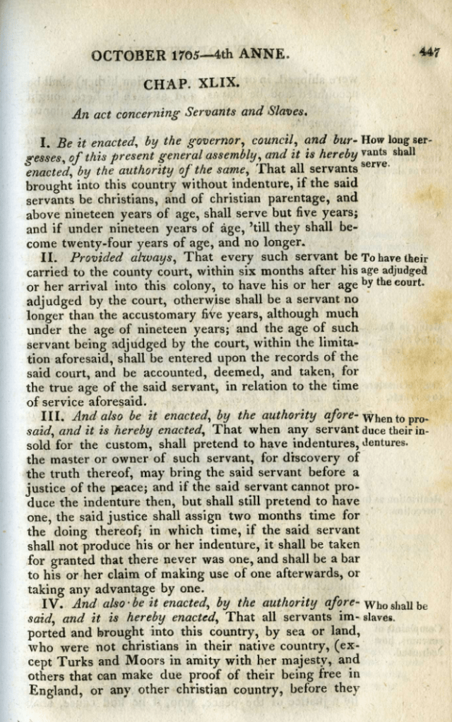 Virginia General Assembly. (1705). An act concerning servants and enslaved people. Encyclopedia Virginia. Retrieved July 28, 2025, from https://encyclopediavirginia.org/primary-documents/an-act-concerning-servants-and-slaves-1705/